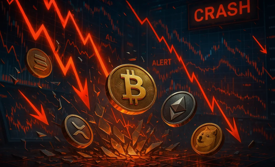 Solana’s price slipped 15%, XRP got hit hardest with a 17% fall (40% intraday), and Dogecoin endured an intense flash crash, briefly plunging 50% before finding some footing again.