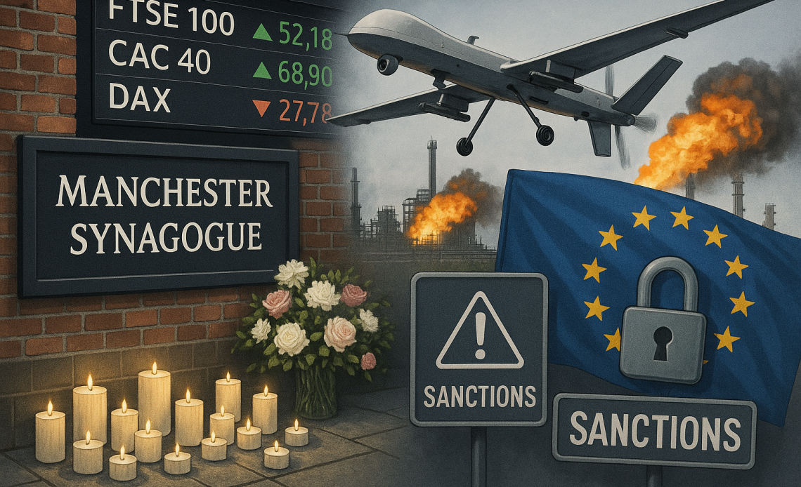 A deadly attack at a Manchester synagogue, activity in the European stock markets, and updates on EU sanctions against Russia dominated headlines.